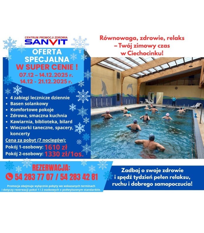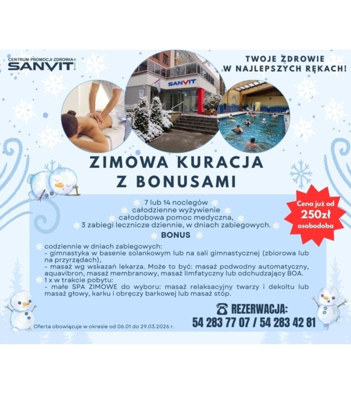 Sanatorium SANVIT zaprasza na wyjątkową Zimową Kurację z Bonusami – przygotowaną z myślą o odpoczynku, regeneracji i poprawie kondycji.